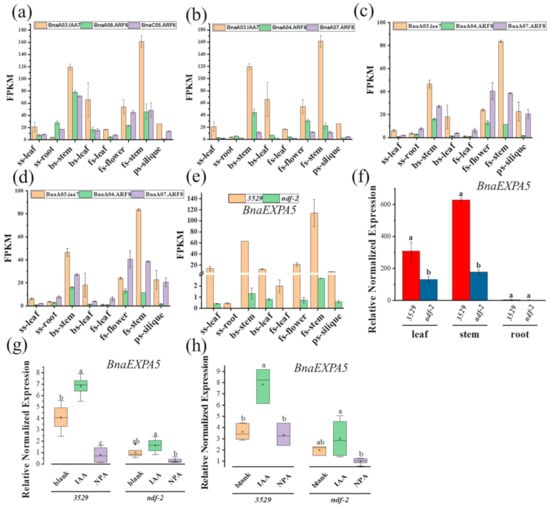 Expression analysis of auxin-related genes in 3529 and ndf-2 mutants. (a–d) The expressions of BnaARF6 and BnaARF8 were compared with that of BnaA03.IAA7 in 3529 (a,b) and ndf-2 (c,d). (e,f) The differential expression of BnaEXPA5 gene between 3529 and ndf-2 was observed in RNA-seq (e) and qPCR (f) results. (g,h) The response of BnaEXPA5 transcription level to IAA or NPA treatment was found in stem (g) and leaf (h). In (a–e), the X-axis represents the plant tissues of different periods. Values are mean ± SD (n = 2 in (a–e), n = 3 in (f–h). The boxplots show the median (horizontal line), 25% and 75% (down and up edge of the box), minimum and maximum (down and up edge of the whiskers), average (square in the box), and outliers (black spots) (n = 4 to 6). Different lowercase letters denote significant differences among the genotypes (f) and conditions (g,h) (p < 0.05, one-way ANOVA followed by Tukey’s test for multiple comparisons). Values are the means ± SD (n = 3).