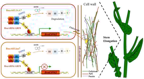 Based on the above results, we propose an auxin dependent model of stem and leaf development in B. napus (Figure 7). BnaA03.IAA7- and BnaARF6/8-dependent signaling pathways stimulate the transcription of BnaEXPA5, which in turn allows auxin responses, including cell expansion and stem elongation. However, we cannot rule out the possibility of other IAAs, ARFs, EXPs or other cell wall synthesis and modification-related genes participating in the regulation of these processes, and how auxin regulates cell wall modifications over time remains elusive. In addition, phytohormones closely related to plant height, such as GA and BR, may also be involved in this process. For example, the transcription factor Brassinazole Resistant 1 can regulate the expression of auxin response genes through the interaction between MR and ARF6 []. The interactions between inhibitors prevent ARF6 and ARF8 from binding to target DNA []. In conclusion, the Aux/IAA and ARF dependent signaling pathways can control cell expansion and stem elongation, which can make rape adapt to the environment.