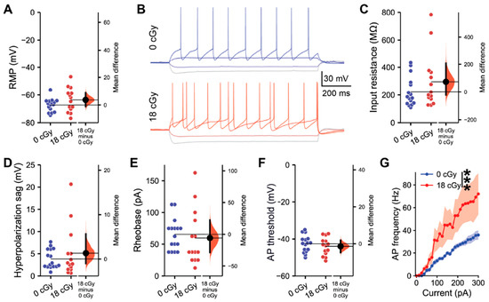 Acute, low-dose, neutron irradiation increases the intrinsic excitability of CA1 pyramidal neurons. All data are from whole cell current clamp recordings of CA1 pyramidal neurons from the superficial layer of the dorsal hippocampus, 3–5 months after acute exposure to 18 cGy neutron irradiation. (A) Resting membrane potential (RMP) was unchanged between groups. (B) Representative examples of responses to a range of brief current injections in 0 cGy and 18 cGy neurons. There was no alteration in either the input resistance (C) or sag during a −100 pA hyperpolarizing current injection (D) between treatment groups. Both the rheobase current (E) and the threshold potential (F) required for action potential (AP) initiation also remained unchanged. (G) Across a range of current injections, neutron irradiated neurons generated more frequent APs. n = 5/5 animals, 16/14 cells (0 cGy and 18 cGy, respectively) for grouped data. Gardner-Altman estimation plots show raw data on the left axis and a bootstrapped sampling distribution on the right axis. A black dot depicts the mean difference between groups and the 95% confidence interval is indicated by the ends of the vertical black bars. Data are presented as Mean ± SEM for (G). *** p < 0.001 (two-way ANOVA).