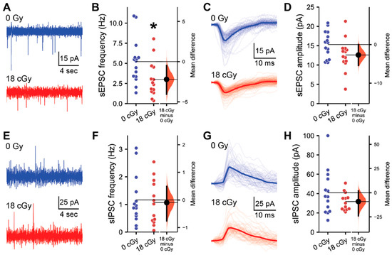Hippocampal excitatory synaptic signaling is suppressed by acute neutron irradiation. All data are from whole cell voltage clamp recordings of CA1 pyramidal neurons from the superficial layer of the dorsal hippocampus, 3–5 months after acute exposure to 18 cGy neutron irradiation. (A) Representative examples of spontaneous excitatory postsynaptic current (sEPSC) recordings from 0 cGy and 18 cGy neurons. (B) The frequency of sEPSCs was reduced in 18 cGy neurons. (C) Aligned examples of sEPSCs in representative 0 Gy and 18 cGy neurons. Light lines show individual sEPSCs, while the darker line displays the average sEPSC during a 200 s recording from that neuron. (D) sEPSC amplitude was also similar between groups. (E) Representative examples of spontaneous inhibitory postsynaptic current (sIPSC) recordings from 0 cGy and 18 cGy neurons. (F) sIPSC frequency was equivalent between 0 Gy and 18 cGy neurons. (G,H) sIPSC amplitude was also unchanged after irradiation. N = 5/5 animals, 15/14 cells for sEPSCs and N = 5/5 animals, 14/13 cells for sIPSCs (0 cGy and 30 cGy, respectively). Gardner-Altman estimation plots show raw data on the left axis and a bootstrapped sampling distribution on the right axis. A black dot depicts the mean difference between groups and the 95% confidence interval is indicated by the ends of the vertical black bars. * p < 0.05 (linear mixed-effect model regression).