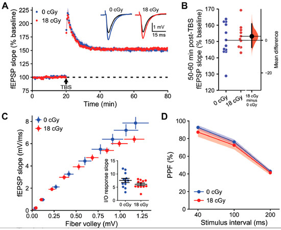 Data in the text are presented as means ± SD, while in the figures as mean ± SEM. The fEPSP slope was measured at 10–90% fall of the slope and data in figures on LTP were normalized to the last 10 min of baseline. Electrophysiological measures were analyzed using a Student’s t-test, p < 0.05. n = 12/10 hippocampal slices from n = 6/6 animals (control and irradiated, respectively).