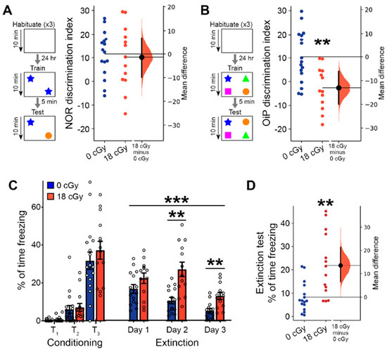 Spatial and fear extinction memory behavior is perturbed by acute neutron irradiation. Behavioral testing of memory function was performed 2–3 months after completion of the 18 cGy acute neutron irradiation. (A) Ability to discriminate between objects in the novel object recognition (NOR) assay was not altered in 18 cGy animals. (B) Object in place (OiP) differentiation of objects relocated to alternative location was diminished following acute neutron irradiation. (C) In a fear extinction assay, initial presentation of 3 tone-shock pairings (T1–T3) lead to increased conditioned freezing behavior. Subsequent tone-only presentations led to greater extinction of conditioned fear in control animals that diminished freezing behavior across 3 days of measurements. (D) After three previous days of fear extinction training, acutely neutron irradiated mice continued to show a diminished ability to extinguish past fear responses. (A,B,D) are Gardner-Altman estimation plots showing raw data on the left axis and a bootstrapped sampling distribution on the right axis. Black dots depict the mean difference between groups and the 95% confidence intervals are indicated by the ends of the vertical black bars. (C) is presented as Mean ± SEM. n = 17/13 animals for NOR and OiP, n = 16/14 animals for fear extinction (0 cGy and 18 cGy, respectively). ** p < 0.01, *** p < 0.001 (Mann-Whitney two-tailed t-test or two-way ANOVA).