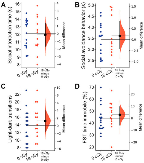 Social interaction and social avoidance behaviors were evaluated in mice 13 weeks after irradiation, using established protocols [67,102,103]. Mice were initially each individually habituated to the well-lit (915 lux) test arena (30 cm × 30 cm) for two days (15 min/day). On the third day of the trial, the test mouse was allowed to explore freely for 10 min, prior to a novel mouse (3-month old, C57BL6/J male, weighing less than the test mouse) being introduced into the arena. The mice were allowed to explore and interact freely without barrier for 10 min, and active interaction or avoidance was recorded. Social interactions included any time the test mouse spent sniffing while in active contact with the novel animal’s snout, flank, or anogenital area, mutual grooming, or directed pursuit of the novel mouse. Concurrently, avoidance behavior was characterized as time the test mouse spent actively avoiding social interactions initiated by the novel mouse.