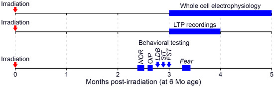 Timeline of post-irradiation experiments. Following acute neutron irradiation when 6 months old, mice were subsequently used in a variety of testing paradigms. Each horizontal timeline indicates experiments conducted in a unique and non-overlapping set of animals (LTP: long-term potentiation; NOR: novel object recognition; OiP: object in place; LDB: light-dark box; SIT: social interaction test; FST: forced swim test; Fear: fear extinction testing).