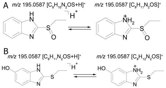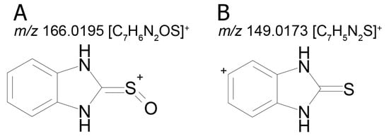 The identical tandem mass spectra of metabolites M1а and M1b provide evidence showing that metabolite M1 (2-thiobenzimidazole) exists in the urine as a mixture of two tautomers. The thione–thiol tautomerism of 2-thiobenzimidazole is well understood. As is known, the thione form is more stable [] and prevails in aqueous solutions at рН < 10 []. The known structures of the tautomers of M1 and the possible charge localization are presented in Figure 1.