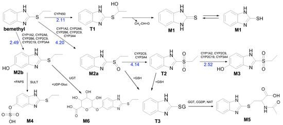 Proposed metabolism pathways of bemethyl. GLORY scores are shown in blue. (CYP) Cytochrome P450 family; (PAPS) 3′-phosphoadenosine-5′-phosphosulfate; (SULT) sulfotransferase; (UDP–Gluc) uridine diphosphate glucuronic acid; (UGT) uridine 5′-diphosphoglucuronosyltransferase; (GSH) glutathione; (GGT) γ-glutamyltransferase; (CGDP) cysteinylglycine dipeptidase; (NAT) N-acetyltransferase. (T1, T2, and T3) Transitional metabolites of bemethyl and (M1, M2a, M2b, M3, M4, M5, and M6) final metabolites of bemethyl.
