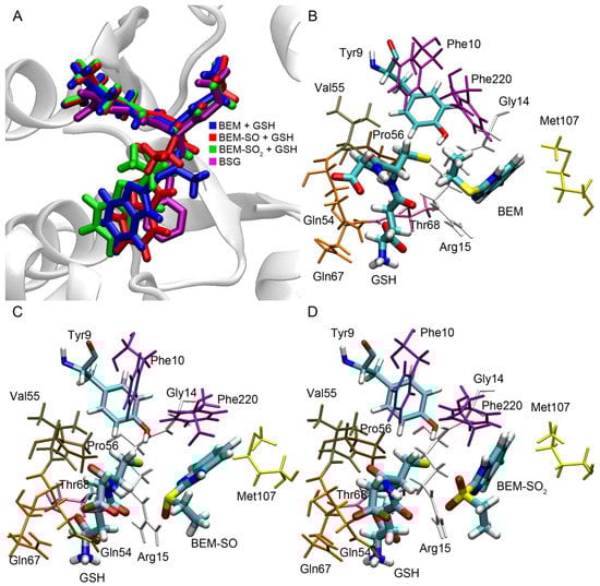 Amino acids residues Tyr9, Phe10, Gly14, Arg15, Gln54, Val55, Pro56, Gln67, Thr68, Met107, Phe220 are involved in binding of GSH, bemethyl, BEM-SO, and BEM-SO2 in the active center of rGSTA1-1. All of these amino acids, with the exception of Met107, are retained in the structure of human GSTA1-1 (hGSTA1-1). Met107 of rGSTA1-1 is replaced by leucine in the primary sequence of hGSTA1-1. Since it is the methyl group of the methionine residue that plays the main role in the steric interaction with the ligands (Figure 9C,D), similar interaction is expected with one of the methyl groups of leucine. Thus, all the molecular modeling results obtained in rGSTA1-1 can be extrapolated to hSTA1-1. For other GST isoforms, further research is needed.