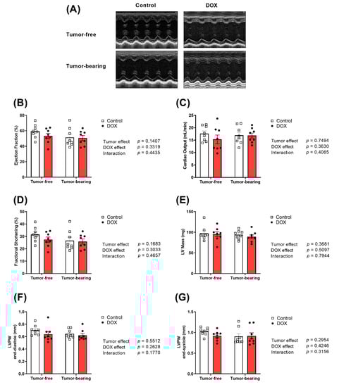 2.2. Effect of DOX Administration on Cardiac Function and Morphometry in Tumor-Free and Tumor-Bearing Mice
