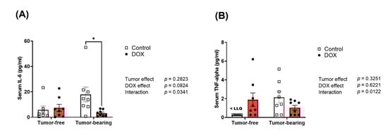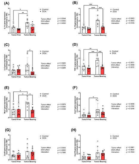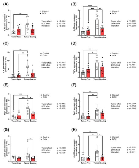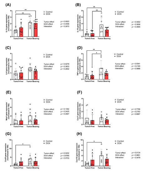 2.4. Effect of DOX Administration on Gene Expression of Inflammatory Markers in the Liver of Tumor-Free and Tumor-Bearing Mice