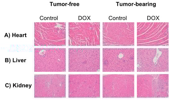 2.6. Effect of DOX Administration on Histopathological Features in the Heart, Liver, and Kidney of Tumor-Free and Tumor-Bearing Mice