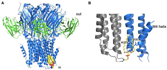 Figure 2. Structure of the Erwinia ligand–gated ion channel (ELIC) in complex with the lipid (PDB: 6HJX [29]). (A) The channel is shown in blue, and the nanobody used to facilitate crystallization is shown in green, both in ribbon representation. A bound Na+ ion is shown in purple, and the bound lipid is shown in yellow. (B) Zoomed-in view of the lipid-binding site with only two channel subunits shown (one grey and one blue) revealing the key interacting Arg and Trp residues shown in blue stick representation with blue carbon atoms and illustrating the kinked M4 helix (blue). The lipid is shown in stick representation with yellow carbon atoms.