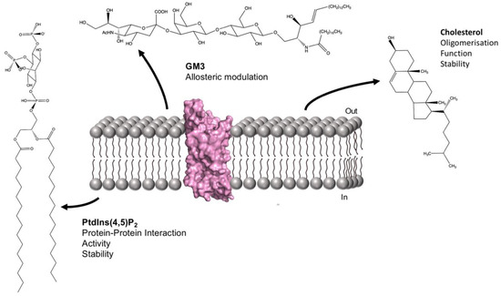 Lipid entityCholesterol Activity regulation [8,9]Activity and changes in conformation [10], Modulation of substrate binding affinity [11]Channel inhibition [12]Activation [13], Signalling [14,15], Stability [16,17], Allosteric regulation [18], Lower affinity ligand binding [17], Oligomerisation [19,20,21,22,23]