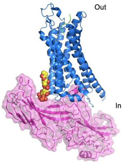 Figure 4. Structure of the NTSR + β-arrestin complex (PDB: 6UP7 [46]). The NTSR is shown in blue ribbon representation with the bound shown in green. The β-arrestin is shown in pink transparent surface representation. The PtdIns(4,5)P2 in contact with both the receptor and the β-arrestin is shown in space filling representation with yellow C atoms.