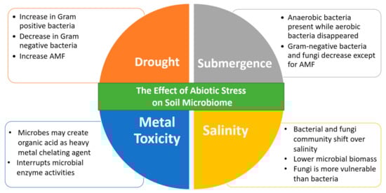 Plant biomass production is directly influenced by soil microbial biodiversity and symbiotic relationship between microorganisms in the soil which contributes to plant nutrient uptake and other physiological processes. Different farming traditions such as type of fertilizer used, crop rotation and tillage also play a major role in the microbial community. Abiotic stressors such as drought, extreme salinity, and other abiotic stressors influence plant carbon metabolism to varying degrees, depending on the stress rate, plant species, and plant tissue type. Duenas et al. [], Mueller and Bohannan [], and Wang et al. [], consistently reported that utilization of N fertilizer in wheat does not affect arbuscular mycorrhizal fungi (AMF) significantly as plants release more exudates with long term N fertilization hence modified soil properties following substantial N addition. AMF receives a higher proportion of plant-derived 13C which modifies the stability of AMF diversity. High N application will contribute to low soil pH. N and P have a higher effect on AMF species diversity as the addition of these sources reduces plant carbon availability to AMF and has the potential to shift AMF from mutualism to parasitism, reducing rhizosphere AMF diversity []. Shift in soil microbial communities such as bacteria and fungi will affect the biogeochemical cycles in the soil thus affect the nutrient assimilation and plant defense mechanism. In terms of abiotic factors, bacterial communities in soil are dependent on soil properties like pH, carbon, nitrogen, and moisture content [,,,]. However, fungal communities are governed more by biotic factors such as plant diversity []. Bacteria and fungal community have a similar effect towards soil variables such as pH, carbon, nitrogen, and moisture content, but the regional abiotic factor such as climate exerts a bigger impact on variation in bacterial community than fungal communities [,]. In this review, we discuss how abiotic stressors affect soil microbe communities and how microbes adapt to the different abiotic stresses.