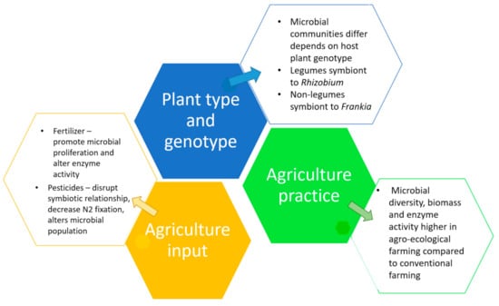 Agricultural methods are believed to have an impact on the soil ecosystem, which in turn determines the soil’s microbiology and plant’s growth rate. Agricultural yield and productivity are increased through a variety of strategies. Depending on their practices and components applied; agricultural management is classified as either conventional or agro-ecological. Agro-ecological farming strives to tread a fine line between human and natural interest, whereas conventional farming is technologically disassociated from nature. In other words, agro-ecological practice is an agricultural system that uses ecologically based pest controls and biological fertilizers derived primarily from animal and plant wastes, as well as N2-fixing cover crops to reduce environmental effect as well as to increase soil nutrient content. Conventional farming on the other hand depends heavily on the utilization of high input modern agriculture that employs chemical pesticides and synthetic fertilizers []. Considering that the microbiome is involved in nearly every soil activity, and microbial composition, diversity, abundance, and activity will primarily enhance crop health and long-term productivity of agricultural land []. Thus, it is critical to maintain the microbiome in outstanding shape in order to preserve the long-term viability of the land. To that end, it is critical to understand the impact of different agricultural practices on soil microbiome, so that safer, more appropriate agricultural practices can be implemented.