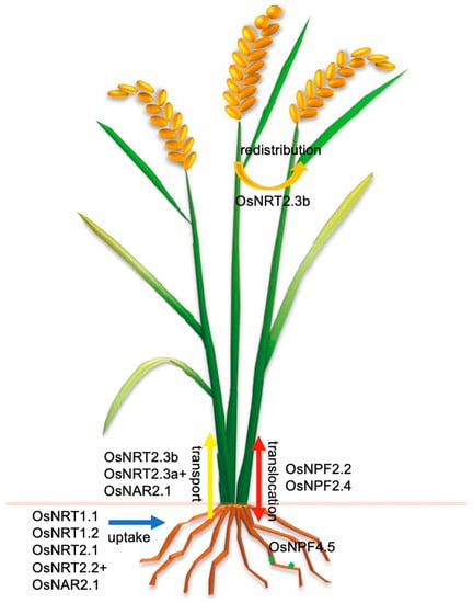 Summary of the contribution of NO3− transporters in rice. OsNRT1.1, OsNRT1.2, OsNRT2.1, and OsNRT2.2 (cooperating with OsNAR2.1) are responsible for NO3− uptake from the soil. OsNRT2.3a cooperating with OsNAR2.1 is responsible for root-to-shoot NO3− transport, and OsNRT2.3b is also responsible for transporting NO3− to the shoot and remobilizing N into the grain. OsNPF2.2 and OsNPF2.4 are involved in NO3− translocation. OsNPF4.5 is induced by mycorrhizal, involved in symbiotic N uptake. Blue line means NO3− uptake, yellow line means transport NO3− from root to shoot, red line means NO3− translocation, orange line means NO3− redistribution.
