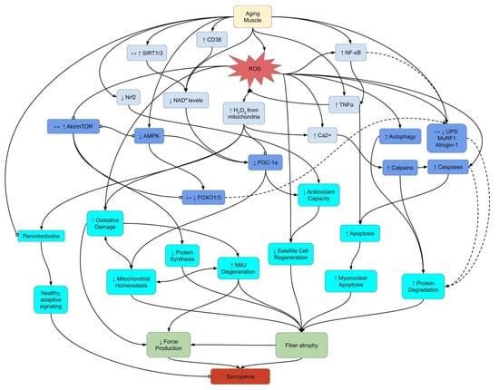 Among all the potential etiological foundations of sarcopenia, the generation of reactive oxygen species (ROS), with the associated oxidative damage and/or defective redox signaling, has stood out as a viable explanation [3,4,5]. With age, cells produce more ROS, even at the resting state, primarily from the mitochondria (mtROS) and from NADPH oxidase (NOX) [3,4]. Although antioxidant enzyme activities in muscle increase with age [5], this compensatory adaptation does not completely counteract the rising oxidative stress. Deleterious oxidative modification of macromolecules causes not only multiple cellular dysfunctions but also distortion of signal transduction pathways that control protein turnover, mitochondrial homeostasis, energy metabolism, antioxidant gene expression, and redox balance (Figure 1). In this short communication, we provide an update and critical review on how increasing ROS with age may modulate the various contributing factors in the development of sarcopenia, such as impaired protein turnover, mitochondrial dysfunction, improper 5′ adenosine monophosphate-activated protein kinase (AMPK) signaling, apoptosis and regeneration, inflammation, neuromuscular dysfunction, and nicotinamide adenine dinucleotide (NAD+) depletion. Finally, we focus on the effort to search for a potential key link between impaired redox signaling and functional deterioration in sarcopenic muscle and highlight the recent discoveries about the role of peroxiredoxin (Prx), a family of antioxidant enzymes that respond to peroxide levels and thereby mediate signal transduction in mammalian cells [6].