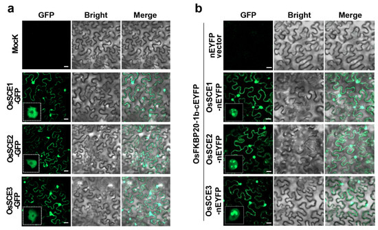A previous report indicated that OsFKBP20 (formerly known as OsFKBP20-1a) interacts with rice OsSCE1 SUMO-conjugating enzymes, OsSCE1 and OsSCE2, based on the yeast two-hybrid assay [41]. In the present study, we investigated potential interactions between the other paralog OsFKBP20-1b and the OsSCE proteins. We initially examined the subcellular localization of the rice OsSCEs by creating fusion constructs consisting of GFP and the three rice SCE genes, OsSCE1, OsSCE2, and OsSCE3. The analysis confirmed that all three C-terminal GFP fusion OsSCE (OsSCE1, 2, 3-GFP) proteins were localized in both the nucleoplasm and cytoplasm (Figure 1a). Then, each OsSCE was N-terminally fused to the YFP fragment (OsSCE1-nEYFP, OsSCE2-nEYFP, and OsSCE3-nEYFP), and OsFKBP20-1b was C-terminally fused to the YFP fragment (OsFKBP20-1b-cEYFP). Tobacco leaves were co-infiltrated with the new constructs. We detected strong fluorescence signals in the nucleus and cytoplasm of tobacco cells co-expressing OsFKBP20-1b-cEYFP and the three OsSCE-nEYFP. Interestingly, substantial interactions between two proteins in the nuclear bodies are clearly indicated by the bright fluorescence signals shown in the enlarged image sections, in contrast to the control cells without interactions (Figure 1b). These results are consistent with the previously reported intracellular localization of OsFKBP20-1b [40], and suggest that OsFKBP20-1b can specifically bind to the OsSCE proteins in the nucleus and cytoplasm.