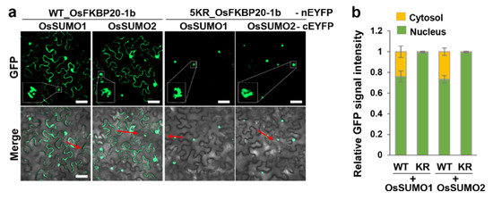 We explored whether the reduced SUMOylation of OsFKBP20-1b (5KR_OsFKBP20-1b) affect the physiological properties of the protein. We initially assessed the interaction between the OsSUMO proteins (fused to cEYFP) and WT_ or 5KR_OsFKBP20-1b (fused to nEYEP) using the BiFC assay. By alignment analysis, two paralogues of rice SUMO (OsSUMO1, and OsSUMO2) were found [43]. Unexpectedly, WT_OsFKB20-1b interacted with OsSUMO1 and OsSUMO2 in the cytoplasm and nucleus, whereas 5KR_OsFKBP20-1b interacted with these proteins only in the nucleus but not in the cytoplasm (Figure 2a). We analyzed the relative GFP signal ratio of the nuclei and cytoplasm using the ZEN system of the confocal microscope. The GFP signal intensity of WT_OsFKBP20-1b interacting with OsSUMO1 or OsSUMO2 was unevenly distributed, with ~75% detected in the nucleus and ~25% in the cytoplasm. However, the 5KR_OsFKBP20-1b mutant had less than 1% of the GFP signal intensity in the cytoplasm (Figure 2b). These results indicated that OsFKBP20-1b interacted with OsSUMO proteins in the cytoplasm via a few strong SUMOylation sites.