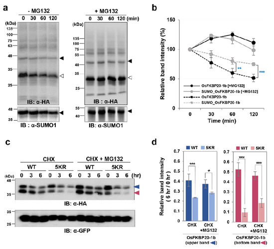 To monitor the role of OsFKBP20-1b SUMOylation, a cycloheximide (CHX) assay was performed to compare the protein stability between WT_OsFKBP20-1b and the 5KR mutant in N. benthamiana. Before analyzing the protein levels, we confirmed that the transcript levels of OsFKBP20-1b did not differ between WT and the 5KR mutant (Figure S3). The plant-expressed recombinant proteins, WT_OsFKBP20-1b and 5KR_OsFKBP20-1b, had two immunoreactive bands detected by the anti-HA antibody, one corresponding to the predicted size of the unmodified OsFKBP20-1b (pink arrow; bottom) and the other to the modified OsFKBP20-1b (blue arrow; upper band). Both of 5KR_OsFKBP20-1b bands were more degraded under CHX treatment in proportion to the processing time than the WT bands. The upper OsFKBP20-1b band of the 5KR_OsFKBP20-1b mutant was more expressed than the corresponding WT band in N. benthamiana (Figure 3c). Next, we calculated and compared the relative amounts of the two recombinant OsFKBP20-1b constructs. Under CHX treatment, the stability of the upper modified OsFKBP20-1b band was approximately 2-fold lower in the 5KR mutant than in the WT construct, and the modified mutant construct was partially rescued by proteasome inhibitor MG132, but not the WT construct. The unmodified OsFKBP20-1b was highly unstable under CHX treatment; its stability was approximately 5-fold lower in the 5KR mutant than in the WT, and the degradation of the unmodified mutant was almost 2-fold reduced by MG132, but not the unmodified WT (Figure 3d). This result revealed that SUMO modification is crucial for stabilizing OsFKBP20-1b in planta.