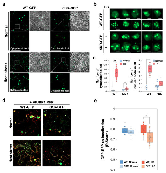 Comparison of nucleus-cytosolic foci localization between WT_OsFKBP20-1b and 5KR_OsFKBP20-1b mutant under heat stress. GFP fused to OsFKBP20-1b WT and OsFKBP20-1b 5KR mutant constructs were transiently expressed in leaves of 4-week-old N. benthamiana using A. tumefaciens infiltration. Two days after infiltration, plants were treated with heat stress on 42 °C for 1 h and then observed GFP fluorescence using confocal microscopy. (a,b) Localization of GFP fused OsFKBP20-1b WT and 5KR mutant after heat stress in epidermal cells. (a) Cytosolic foci focusing images; bar = 20 μm. The dotted white box indicates the magnified region show in the inset. (b) Nucleus focusing images; bar = 5 μm. (c) Number of cytoplasmic foci and nuclear bodies. The numbers of foci were totally counted and divided the number of cells. Error bars represent standard deviation (n = 20 cells). (d,e) Co-localization of OsFKBP20-1b WT or 5KR with stress granule. Stress granule marker protein AtUBP1-RFP and the OsFKBP20-1b-GFP constructs co-expressed in the leaves of N. benthamiana. GFP and RFP co-localization score was calculated using the JACoP software and is represented as R-score. Student’s t-test; ** p-value < 0.05, *** p-value < 0.01. WT-GFP, WT_OsFKBP20-1b-GFP; 5KR-GFP, 5KR_OsFKBP20-1b-GFP.