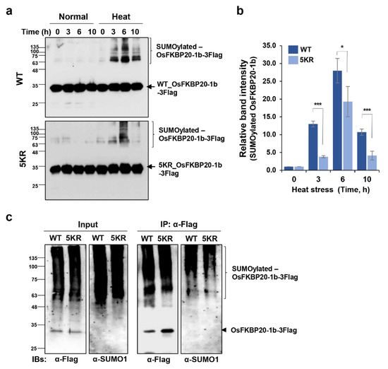 SUMO conjugates noticeably increase when plant cells are exposed to environmental stresses, in particular, SUMO 1/2 conjugation is an early plant response to heat stress [46]. Since OsFKBP20-1b is conjugated to SUMO1 and SUMO3 in reconstitutive E. coli cells, we tested endogenous OsFKBP20-1b SUMOylation status in response to heat stress. To exclude the effect of newly synthesized OsFKBP20-1b, we performed cyclohexamide treatment before the time course heat stress treatment (42 °C for 0, 3, 6, and 10 h). The WT_ and 5KR_OsFKBP20-1b proteins were mainly detected to 35 kDa size band from the total proteins in the normal condition, while, these proteins exhibited multiple slowly migrating bands above the original band (>60 kDa, SUMO conjugated-like) within 3 h of heat treatment (Figure 5a). Interestingly, the SUMO conjugated-like WT_OsFKBP20-1b distinctly increased, and this increase maintained from 3 h and until 10 h after heat treatment. We the quantified the SUMO conjugated-like bands of OsFKBP20-1b. Compared to the band intensity of WT_OsFKBP20-1b, that of the SUMO conjugated-like protein bands of 5KR_OsFKBP20-1b decreased by approximately 3- and 2-fold at 3 and 10 h, respectively, and decreased a little at 6 h (Figure 5b). Next we determined whether OsFKBP20-1b is a SUMO substrate in planta by performing IP with anti-Flag under heat stress conditions (42 °C for 3 h). Before the IP step, all SUMOylated proteins were detected by the anti-SUMO1 antibody, whereas only SUMOylated OsFKBP20-1b proteins were detectable after the IP step. Subsequent immunoblot analysis of the pull-down proteins revealed that substantially fewer 5KR_OsFKBP20-1b were SUMOylated than WT_OsFKBP20-1b and OsFKBP20-1b was SUMOylated in planta (Figure 5c). From the result, we suggest the SUMO conjugation is relatively reduced in the 5KR SUMOylation site mutant.
