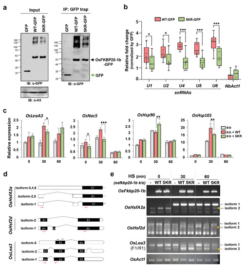 snRNAs and transcription level of stress responsive genes in association with either WT_OsFKBP20-1b or 5KR_OsFKBP20-1b. (a,b) GFP fused OsFKBP20-1b WT and OsFKBP20-1b 5KR mutant constructs were transiently expressed in leaves of N. benthamiana using A. tumefaciens infiltration. (a) GFP fused proteins were extracted from the leaves and these proteins were purified by immunoprecipitation (IP) using a GFP trap. HistoneH3 antibody used for nuclear protein loading control. (b) RNA immunoprecipitation (RIP) assay. NbSnRNAs (U1, U2, U4, U5, and U6) and NbActin (NbAct1) were detected by RT-qPCR. The value of GFP fused to OsFKBP20-1b WT and 5KR was normalized by GFP control. Bars represent SEM of nine biological replicates. Student’s t-test; * p < 0.1, ** p < 0.05, *** p < 0.005. (c–e) Protoplasts were isolated from the shoots of osfkbp20-1b k/o seedlings, and WT_ and 5KR_OsFKBP20-1b proteins were transiently expressed by PEG mediated transfection assay. Total RNA was isolated at 22 h (0 min) after protoplast transfection and 30–60 min after heat stress treatment. (c) Transcript expression levels of abiotic stress-responsive genes (OsLea3 and OsNac5) and heat stress-responsive genes (OsHsp90 and OsHsp101). Transcripts were detected using semi-quantitative RT-PCR analysis. OsAct1 was used as the normal control. Bars represent mean SEM of three biological replicates. Student’s t-test; * p < 0.05, ** p < 0.01. (d,e) Semi-quantitative RT-PCR analysis of alternative splicing patterns of stress-responsive genes in mutant seedlings. Alternatively, spliced isoforms of OsHsfA2a, OsHsf2d, and OsLea3 are presented in (d). OsAct1 was used as a loading control. Red arrows indicate the primer sites used.