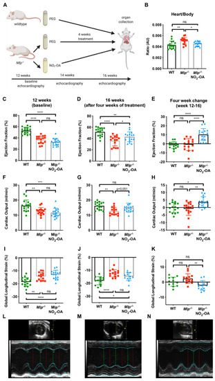 Effect of NO2-OA on left ventricular systolic function in DCM. (A) Experimental design of murine model treatment. (B) Heart-weight-to-body-weight ratio is reduced after 4 weeks of treatment with NO2-OA. Baseline echocardiographic assessment of (C) LVEF, (F) CO, and (I) GLS shows reduced baseline parameters in 12-week-old Mlp−/− animals compared to WT and (D,G,J) improved parameters in 16-week-old animals after 4 weeks of treatment with NO2-OA. Absolute change of LVEF, CO, and GLS from weeks 12–16 is shown in (E,H,K). Representative M-mode echocardiography tracings of (L) WT, (M) Mlp−/−, and (N) Mlp−/− + NO2-OA at 16 weeks. Data are expressed as mean ± SD, * p < 0.05, ** p < 0.01, *** p < 0.001, **** p < 0.0001, one-way ANOVA with Tukey multiple comparison test, n = 15–17 as indicated.