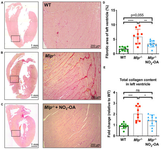 As myocardial fibrosis is a hallmark feature of DCM and anti-fibrotic properties of NO2-OA have been observed [14], we assessed the extent of left ventricular fibrosis via picrosirius red staining. As expected, extensive myocardial fibrosis was found in vehicle-treated Mlp−/− mice compared to WT controls. Treatment with NO2-OA reduced the extent of LV myocardial fibrosis to WT levels (Figure 2A–D). Similarly, the total collagen content in LV homogenates was significantly increased in Mlp−/− animals compared to WT controls and this effect was alleviated in Mlp−/− mice treated with NO2-OA (Figure 2E).