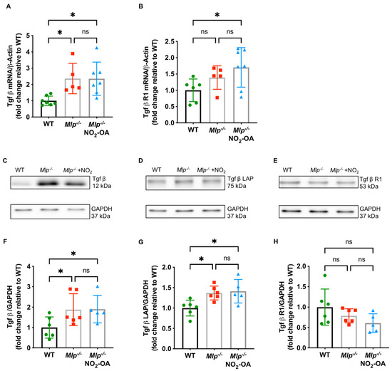 TGFβ is a key driver of myocardial fibrosis, with aberrant TGFβ signaling linked to pathogenic fibrosis. To test whether TGFβ signaling is altered in Mlp−/− mice, we analyzed homogenized LV tissue by Immunoblot and qPCR and detected significantly increased protein and mRNA levels of TGFβ (Figure 3A,C,F) and the TGFβ latency-associated protein (LAP) (Figure 3B,D,G). NO2-OA treatment did not affect the expression of TGFβ and its receptor TGFβ-R1, suggesting a potential effect of NO2-OA downstream to the TGFβ signaling cascade (Figure 3E,H).