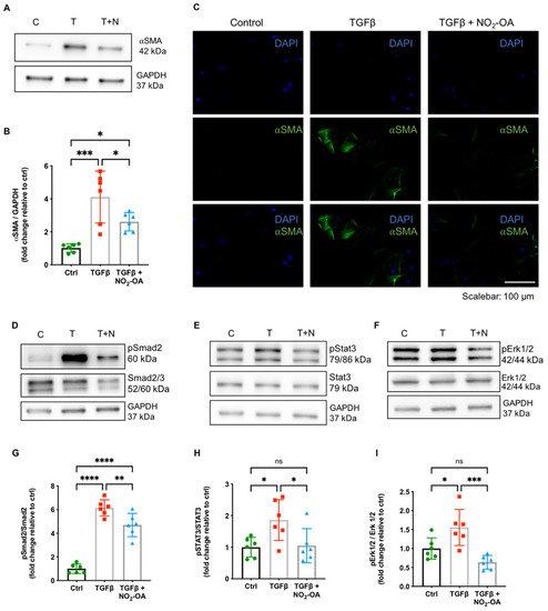 Effect of NO2-OA on TGFβ signaling in isolated primary cardiac fibroblasts. Representative (A) immunoblots, (B) quantification for expression of ⍺SMA, and (C) representative immunofluorescence show an increased ⍺SMA expression in cardiac fibroblasts upon treatment with TGFβ, which is significantly attenuated by concomitant treatment with NO2-OA. Protein expression analysis of the phosphorylation ratio of Smad2 (D,G), Stat3 (E,H), and Erk1/2 (F,I) revealed attenuated phosphorylation by NO2-OA. Data are expressed as mean ± SD, * p < 0.05, ** p < 0.01, *** p < 0.001, **** p < 0.0001, one-way ANOVA with Tukey multiple comparison test, n = 6 as indicated, scalebar as indicated.