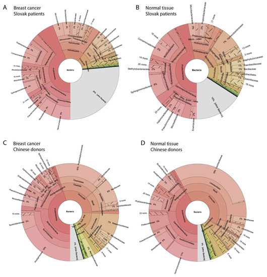 In breast tumour tissues of Slovak women (18 samples) the same phyla as in healthy tissue are the most abundant, while a portion is changed: Proteobacteria (44%), Actinobacteria (16%), Firmicutes (9%) and Bacteroidetes (3%).