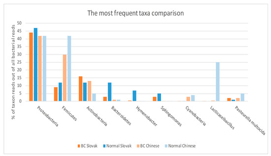 Comparison of abundance (in % of all bacterial reads calculated by Krona evaluation of multiple Kraken2 ouputs) of the most frequent taxa between all basic groups: breast tumour tissue of Slovak patients with breast cancer, normal breast tissue of Slovak donors, breast tumour tissue of Chinese patients with breast cancer (SRA study PRJNA553096), normal breast tissue of Chinese donors (SRA study PRJNA553096), Numerical values for every sample individualy are listed in the Supplementary Table S1.