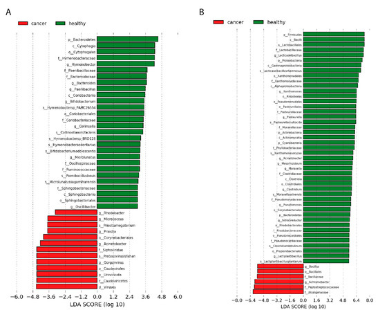 Differentially represented taxa (by different transcript numbers) between normal breast tissue samples (from cancer-free donors) and breast tumour tissue. Taxa on the left have a higher abundance of their transcript in primary breast tumour tissue, while those on the right have higher numbers in normal breast tissue. (A) Comparison of the microbiome in primary tumours of Slovak patients and normal breast tissue of Slovak cancer-free donors. Since standard conditions identified too many results, to visualise data, LEfSe was run with parameters (LDA > 3, Kruskal Wallis test p-value < 0.05, Wilcoxon test p-value < 0.05); (B) Comparison of microbiome in primary tumours of 72 patients from China and 18 normal breast tissues of cancer-free donors from China. For visualisation, LEfSe was run with parameters (LDA > 5.5, Kruskal Wallis test p-value < 0.05, Wilcoxon test p-value < 0.05), for the purpose of visualising the best hits. Full results of LEfSe (LDA > 2) are available on the website http://www.embnet.sk/supp/BC_metatranscriptomics/complete_plots_plotLEfSeResults/ (accessed on 19 August 2021).