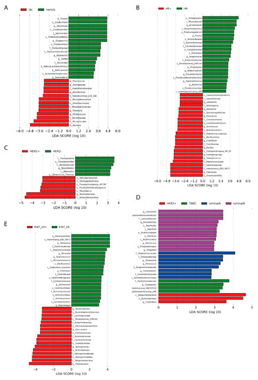 Differentially represented taxa (by different transcript numbers) in primary tumour tissues of Slovak patients between multiple markers statuses. For all comparisons, LEfSe was run with parameters: LDA > 3 (stricter than default LDA > 2 just for purpose of visualisation), Kruskal Wallis test p-value < 0.05, Wilcoxon test p-value < 0.05. (A) Comparison of the microbiome in primary tumours of patients with CTC in their blood and primary tumours of patients without CTC detected in their blood (LDA threshold = 3); (B) Comparison of the microbiome in primary tumours of patients positive on HR marker and negative on HR marker; (C) Comparison of the microbiome in primary tumours of patients positive on HER2 marker and negative on HER2 marker; (D) Comparison of molecular subtypes: Luminal A, B, HER2+, Triple negative (LDA > 2); (E) Comparison of the microbiome in primary tumours of Ki67 > 20% and Ki67 < 20%. Full results of LEfSe (LDA > 2) are available on the website http://www.embnet.sk/supp/BC_metatranscriptomics/complete_plots_plotLefSeResults/ (accessed on 19 August 2021).