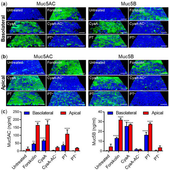 Recently, we showed that an elevated cellular cAMP concentration resulting from CyaA toxin action triggers Muc5AC production in air-liquid interface (ALI)-grown differentiated VA10 human bronchial epithelial cells []. Since Gαi/o inactivation by PT can also yield increased cAMP levels, we investigated if PT also triggers mucin production in airway epithelial cells. ALI-grown VA10 cell layers were exposed for 24 h to 100 ng/mL of PT and the cell layers were fixed for Muc5AC and Muc5B production assessment by confocal fluorescence microscopy. In parallel, the amounts of Muc5AC and Muc5B secreted onto the apical surface of cells were quantified in washes of cell layers by ELISA. For comparison, the cells were exposed to 20 µg/mL of forskolin, to activate the endogenous AC enzyme [], or to the ATP to cAMP converting CyaA toxin (100 ng/mL). As shown in Figure 1, irrespective of whether the purified PT and CyaA toxins were applied from the basolateral or the apical side of the polarized VA10 cell layer, the action of either toxin significantly upregulated Muc5AC and Muc5B production by the epithelial cell layer to a similar extent as induced by forskolin. In contrast, cells treated with buffer or the enzymatically inactive CyaA-AC– or PT-R9K/E129A (PT–) toxoids produced only basal levels of Muc5AC and Muc5B. Hence, induction of mucin production in differentiated VA10 bronchial epithelial cells was strictly due to the catalytic activities of the toxins (cAMP-generating adenylyl cyclase activity of CyaA and ADP-ribosylating activity of the S1 subunit of PT), which directly (CyaA) or indirectly (PT) increase cellular cAMP levels.