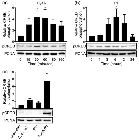 Purified CyaA and PT stimulate phosphorylation of CREB. Either 100 ng/mL of CyaA (a) or 100 ng/mL of PT (b) were added basolaterally to ALI-grown polarized VA10 cell layers for the indicated times. For comparison, 100 ng/mL of CyaA-AC– for 30 min, or 100 ng/mL of PT– for 6 h, were added as negative controls and 20 μg/mL of forskolin for 30 min was added as a positive control, respectively (c). Cell layers were lysed and nuclear lysates were analyzed by Western blotting. Activating phosphorylation of the Ser133 residue of CREB (pCREB) was detected using a pCREB-specific antibody. Immunoblots developed with anti-PCNA (proliferating cell nuclear antigen) antibody served as loading controls. Data represent mean with SEM from eight (a) or three (b,c) independent experiments. * p < 0.05; ** p < 0.01 compared with untreated cell layers (time 0 in (a,b)).