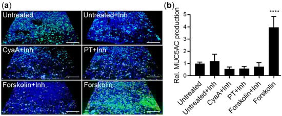 B. pertussis infection was reported to induce mucin gene transcription in bronchial epithelial cells [] and we recently found that CyaA-produced cAMP signaling induces Muc5AC production in human bronchial epithelial cells cultured at the air–liquid interface []. Here, we show that the CyaA and PT toxins upregulate Muc5AC and Muc5B production in airway epithelial cell layers in vitro through a cAMP-activated PKA/CREB-dependent pathway and that CyaA alone upregulates mucus secretion in B. pertussis-infected mouse trachea in vivo.