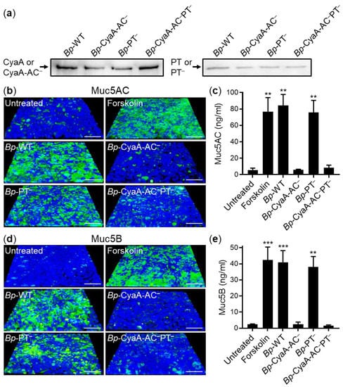 We next examined if the CyaA and PT amounts secreted during B. pertussis infections of airway epithelial cell layers are sufficient for triggering mucin production. Therefore, VA10 cell layers were infected at a multiplicity of infection (MOI) of 50:1 from the apical side with wild-type B. pertussis Tohama I strain (Bp-WT) that produces both CyaA and PT toxins, or by its Bp-CyaA-AC–, Bp-PT– or Bp-CyaA-AC–PT– toxoid-secreting isogenic mutants, respectively (Figure 4a). After 24 h, the cell layers were fixed and stained for Muc5AC or Muc5B (Figure 4b,d) and in parallel the amounts of apically secreted Muc5AC and Muc5B were determined by ELISA (Figure 4c,e). As shown in Figure 4b–e, infection by Bp-WT, or the Bp-PT– mutant producing intact CyaA, induced similar Muc5AC and Muc5B production in polarized VA10 cell layers as the treatment with forskolin. In contrast, epithelial cell infections with the Bp-CyaA-AC– mutant that secreted the CyaA-AC– toxoid but produced active PT, failed to trigger any increase of Muc5AC and Muc5B production above the level of mucin production by uninfected cells (Figure 4b–e). It can thus be concluded that the CyaA toxin amounts secreted by B. pertussis were alone sufficient for induction of mucin production in infected VA10 cell layers and the secreted PT on its own did not trigger any mucin production under the used experimental conditions in vitro.