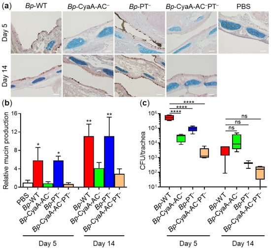 As documented in Figure 5a and quantified in Figure 5b, infection by the Bp-WT strain significantly increased the amount of mucin accumulating in the tracheas of animals on day 5 of infection, when the CFU count of Bp-WT in the tracheas reached ~5.6 × 105 CFU/trachea (Figure 5c). A further increase in the amount of mucin accumulated in the tracheas of Bp-WT-infected animals was observed on day 14, despite the fact that the CFU counts of the Bp-WT bacteria already decreased to ~4.2 × 103 CFU/trachea. As also shown in Figure 5a,b, the Bp-PT– mutant secreting the active CyaA toxin increased the amount of mucin accumulated in the tracheas to a similar extent as the infection by the parental Bp-WT strain, despite a reduced trachea colonization capacity (~9.6 × 104 vs. ~5.6 × 105 CFU on day 5 and ~4.1 × 102 vs. ~4.2 × 103 CFU on day 14; Figure 5c). In contrast, the Bp-CyaA-AC– mutant, secreting active PT and reaching insignificantly higher CFU counts in mouse tracheas on day 14 than Bp-WT, failed to increase mucin levels in infected tracheas on day 5 at all and provoked only insignificant increase in mucin production in the tracheas by day 14. Similarly, infection by the double Bp-CyaA-AC–PT– mutant, which colonized the mouse trachea only poorly, did not provoke any observable upregulation of tracheal mucin production over the level of uninfected control mice. Collectively, these data show that the production of CyaA alone accounted for increased mucin production in the tracheas of B. pertussis-infected mice and PT activity contributed only little, if at all, to the induction of mucin secretion in the airways of infected animals.
