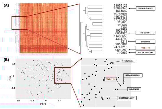 Results of structural similarity; (A) hierarchical clustering and (B) multidimensional clustering. The hierarchical clustering method repeats the process of finding the two most similar structures, then aggregating into the same cluster until all rows are clustered. After the repetition, structurally similar chemicals are arranged together to generate dendrogram. A multidimensional clustering technique is used to visualize high dimensional data into two-dimensional space. This method transforms the coordinate vectors to explain the highest two variances of the dataset. Hierarchical clustering showed that 18 compounds had a similar structure within the respective libraries. Among the 18 compounds, we found that five compounds were overlapped in multidimensional clustering analysis.