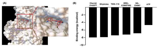 Finally, we performed molecular docking using AutoDock v.4 on GSK-3β (PDB: 3I4B) for five compounds (TWS-119, ellipticine, BRD-K39687892, SB-334867, and CHEMBL2142877) because TWS-119 was known as a GSK-3β inhibitor. These tested inhibitors showed negative binding energy. Ellipticine (except for CHEMBL2142877, which cannot be purchased) showed the highest binding affinity (−7.8 kcal/mol) than did TWS-199 (−7.5 kcal/mol) and other compounds (BRD-K39687892, −7.1 kcal/mol; SB-334867, −6.9 kcal/mol; and ATP, −4.6 kcal/mol) (Figure 2).