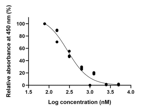 The efficacy of ellipticine was verified in vitro to confirm that virtual screening was useful. It was tested in human umbilical vein endothelial cells (HUVECs) for 24 h using the cell counting kit-8 (CCK-8) assay. Analysis of the cell viability assay by individual dose ellipticine using twofold serial dilutions (from 10,000 to 78.125 nM) is presented in Figure 3. Because ellipticine, a topoisomerase II inhibitor, is an anticancer drug, a cell viability assay was used to measure appropriate drug concentrations that do not cause cell death. Thus, a concentration of 156.25 nM was used for the following cellular experiments.