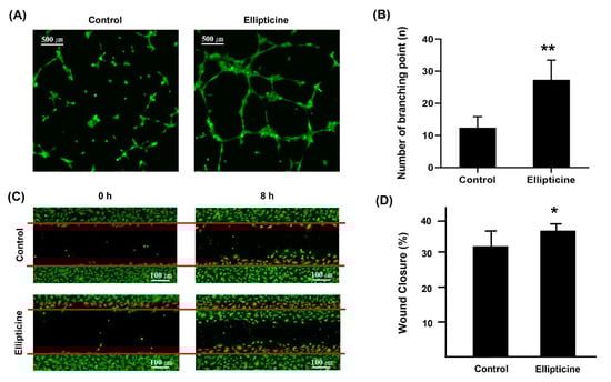 We performed an HUVEC angiogenesis assay (Figure 5A,B). HUVECs treated with ellipticine showed a significantly greater number of tubes and branch points than the control (DMSO treatment). Additionally, we tested the effect of ellipticine on HUVEC collective bidimension through the wound-healing assay. We found a significantly greater increment in wound closure after 8 h of incubation in ellipticine-treated cells with respect to control cells (Figure 5C,D). Furthermore, cell migration was enhanced with the presence of low-dose ellipticine.