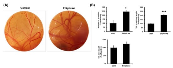 Chorioallantoic membrane (CAM) assay for pro-angiogenic effect. CAMs were treated with either 156.25 nM ellipticine or DMSO as a control for 96 h (A). The number of branches, total branch length, and total tube length were measured and shown (B). * p < 0.05, *** p < 0.001.