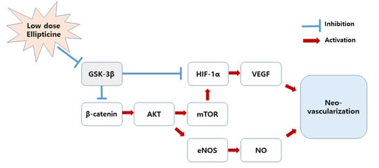 The possible pro-angiogenic mechanism for low concentrations of ellipticine is as follows: β-catenin has a positive effect on the serine/threonine-specific protein kinase-mechanistic target of rapamycin (AKT-mTOR) pathway [], thereby inducing endothelial nitric oxide synthase (eNOS) expression and increasing nitric oxide (NO) []. Additionally, an activated AKT enhances the expression of hypoxia-inducible factor-1α (HIF-1α), which has a great influence on the increase in vascular endothelial growth factor (VEGF) []. Eventually, both NO and VEGF play an essential role in promoting vascular regeneration. Conversely, because GSK-3β negatively regulates β-catenin and HIF-1α [,], low-dose ellipticine is thought to facilitate angiogenesis by inhibiting GSK-3β (Figure 7).