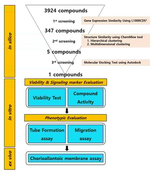 The general chemical screening procedure is described in Figure 8. Gene Expression Omnibus (GEO) microarray datasets related to angiogenesis studies were collected for the first screening. The GEO2EnrichR web application and R packages were used to extract the characteristic direction (CD) to identify differentially expressed gene signatures. The CD method brings multivariate gene information to a single direction in hyperspace, which makes it possible to compare similar gene signature information. All microarray datasets were extracted with a cutoff of 500, and other options were default conditions. The extracted CD signatures from GEO2EnrichR were used as input data on L1000CDS2 to screen pro-angiogenic molecules. L1000CDS2 is a web-based search engine that includes CD signatures of thousands of small molecules.
