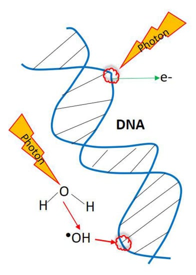 Scheme of the direct or undirect influence of the high-energy electromagnetic radiation on DNA.