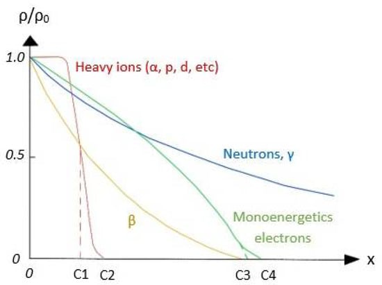The emission particles, such as α and β, are of low penetration, although in their passage, they cause important damages in the matter. Figure 2 displays the relative transmission (ρ/ρ0) of a particles flux (ρ0) through and absorbing material with x thickness. The decrease in transmission is associated with the processes of interaction with matter. As seen, emission particles (α and β) are absorbed in average thickness ranges lower than neutrons or gamma rays. Moreover, alpha particles produce processes such as ionization, nuclear scattering, nuclear excitation, or nuclear transmutation. These processes involve collisions of the particles and consequently the emitted particles experience loss of energy. In addition, α and β particles are charged, so they are more susceptible to interact with the matter than uncharged particles, such as neutrons. On the other hand, it is observed in Table 1 that gamma radiation presents numerous processes when absorbed by matter, and its penetration into matter is only comparable with neutrons.
