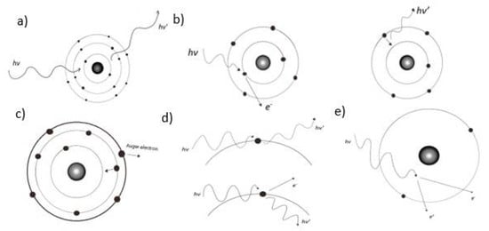Schematic representation of Rayleigh scattering (a), the photoelectric effect (b), Auger effect (c), Compton scattering (d), and pair production (e).